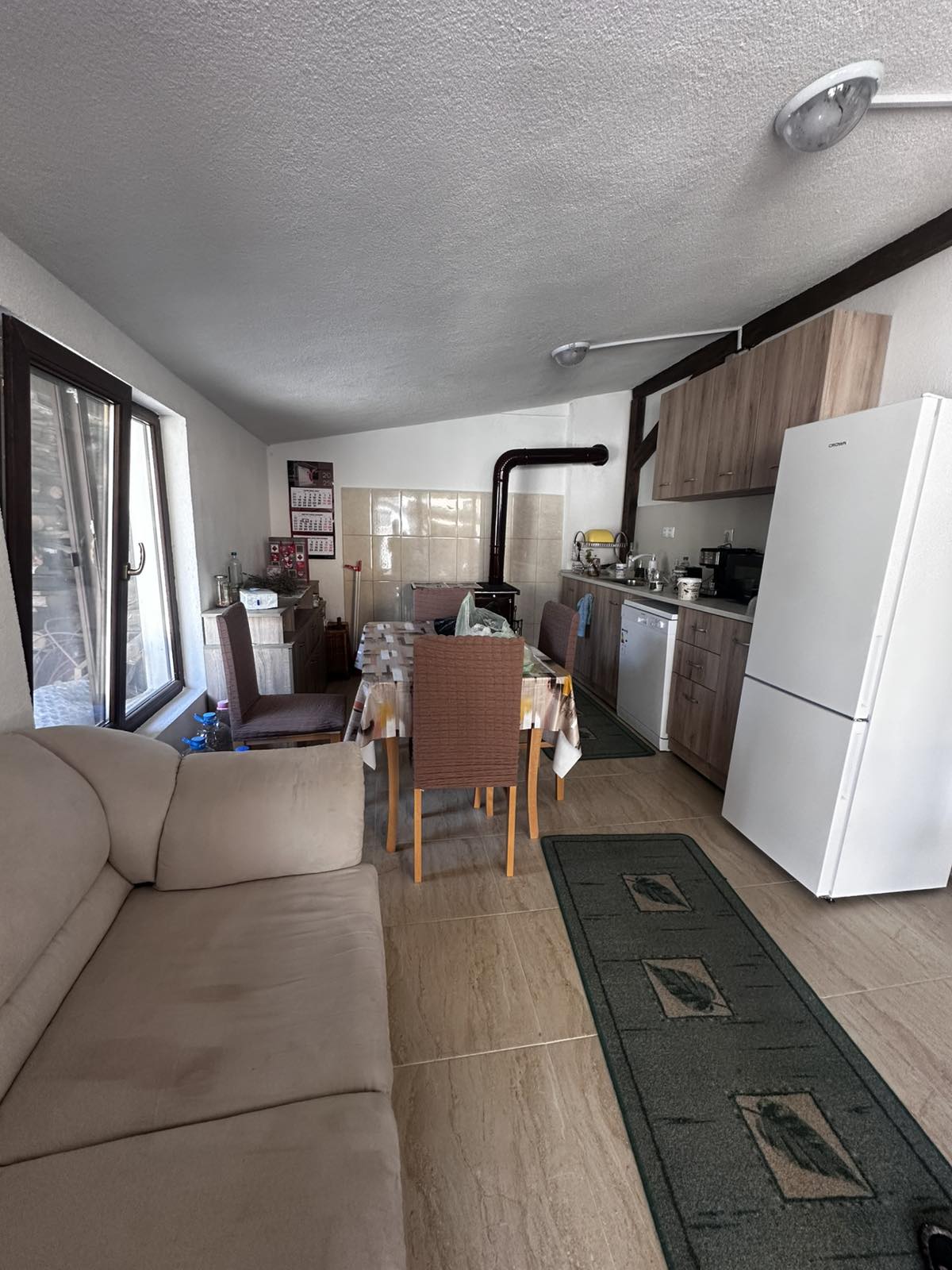 Всекидневна/механа с каменни стени, диван и камина на пелети с водна риза (захранваща радиаторите в цялата къща).