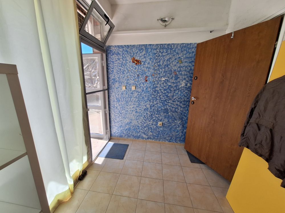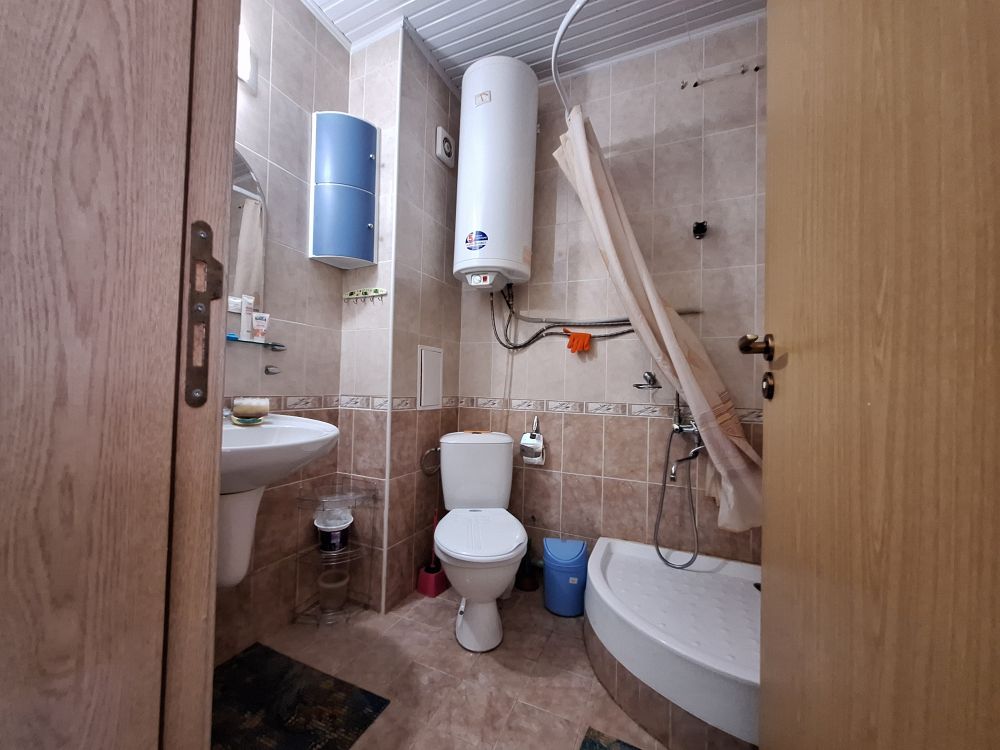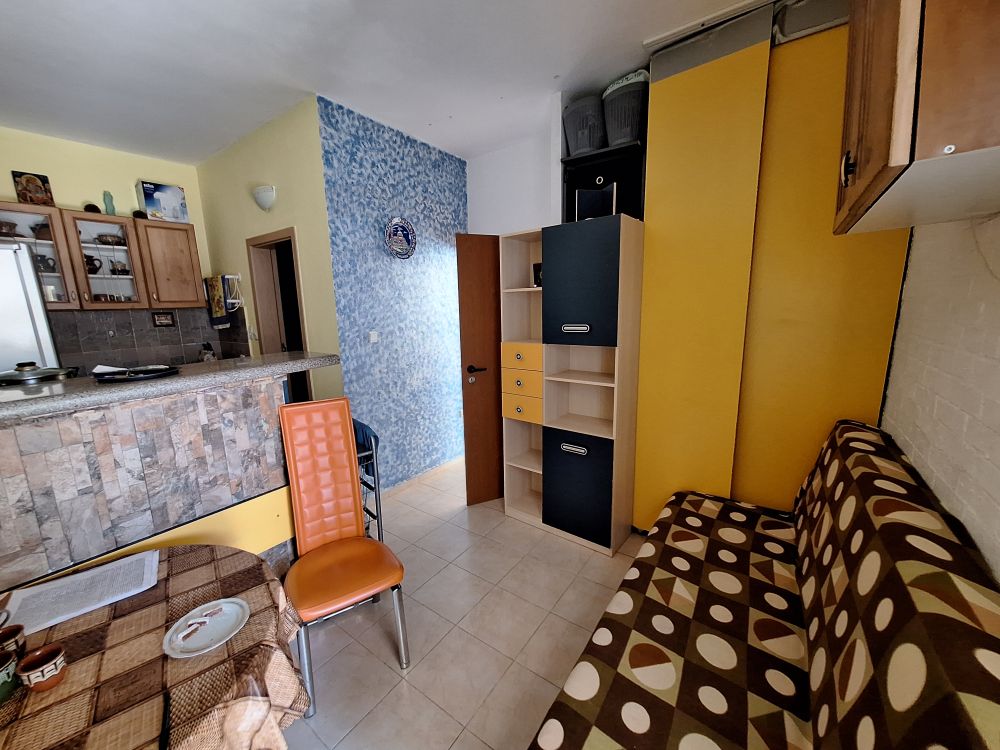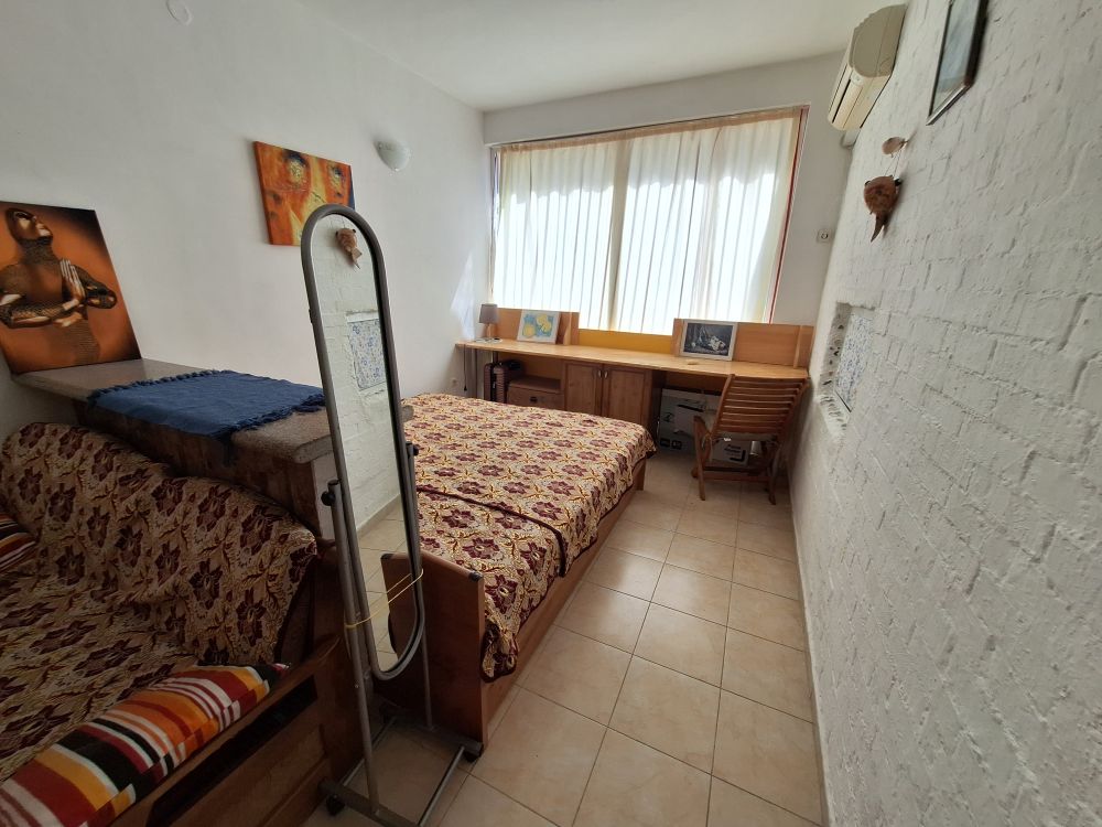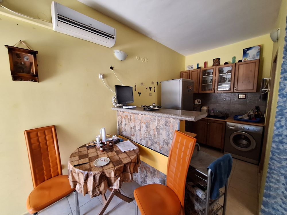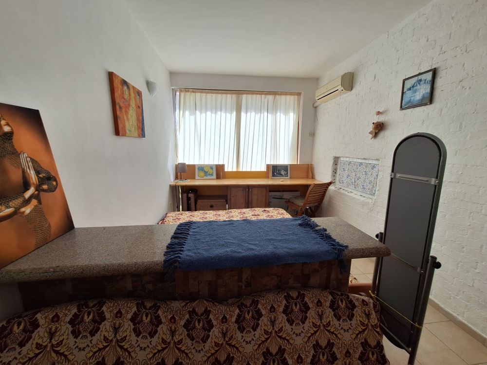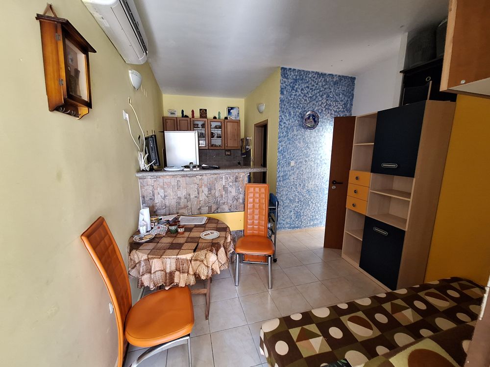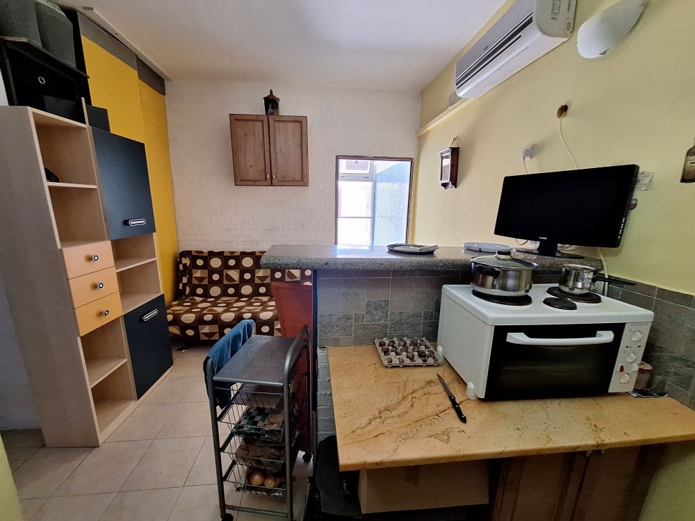 The interior layout is practical and fully furnished for immediate use. The property features a spacious living area with a fitted kitchenette, equipped with essential appliances such as a refrigerator, washing machine, and stove. Adjacent to it is a transitional room currently organized with a large bed, wardrobe, and a dedicated workspace, giving the area a multifunctional feel. The bathroom is fully equipped with a shower cabin and an individual water heater, while air conditioning is installed in the main room for year-round comfort.
