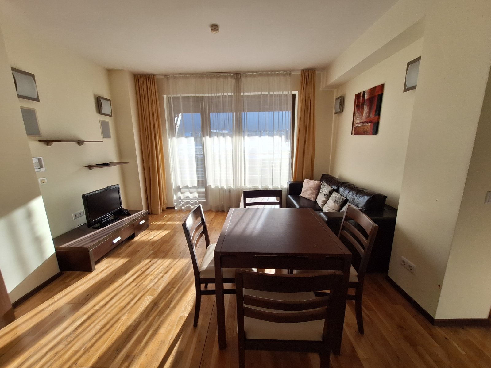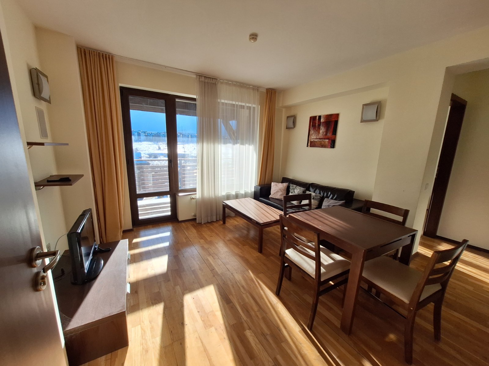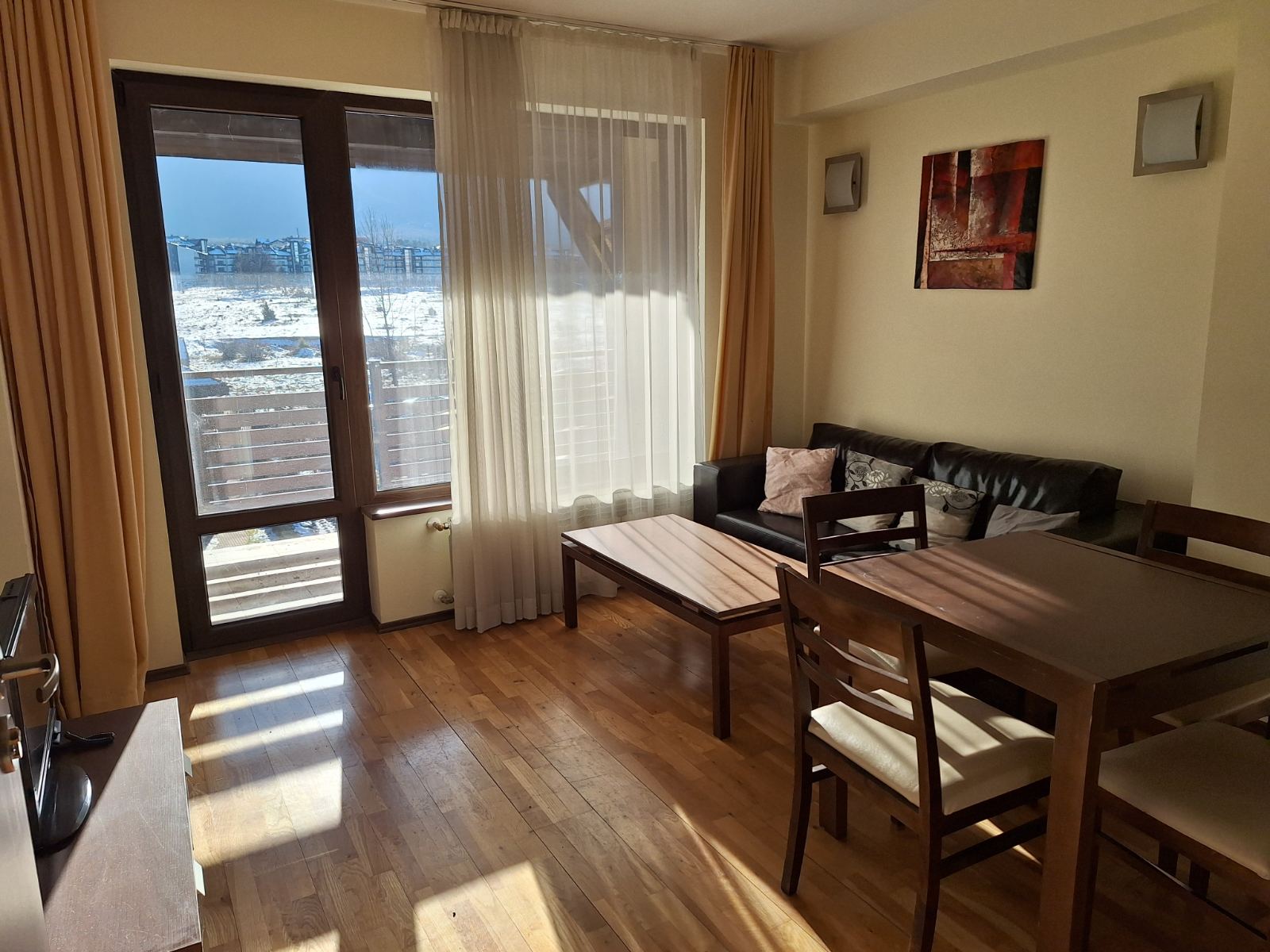 The interior layout is functional and designed for maximum comfort. It comprises an entrance hall leading to a spacious living room with a modern kitchenette, fully equipped with a washing machine, refrigerator, and stove. The master bedroom features its own private en-suite bathroom, providing privacy and convenience. A second bedroom is served by a second bathroom equipped with a bathtub. One of the highlights of this property is the expansive, sun-drenched balcony offering panoramic views of the Pirin Mountains. This property is an excellent choice for both a personal holiday retreat and a high-potential rental investment.