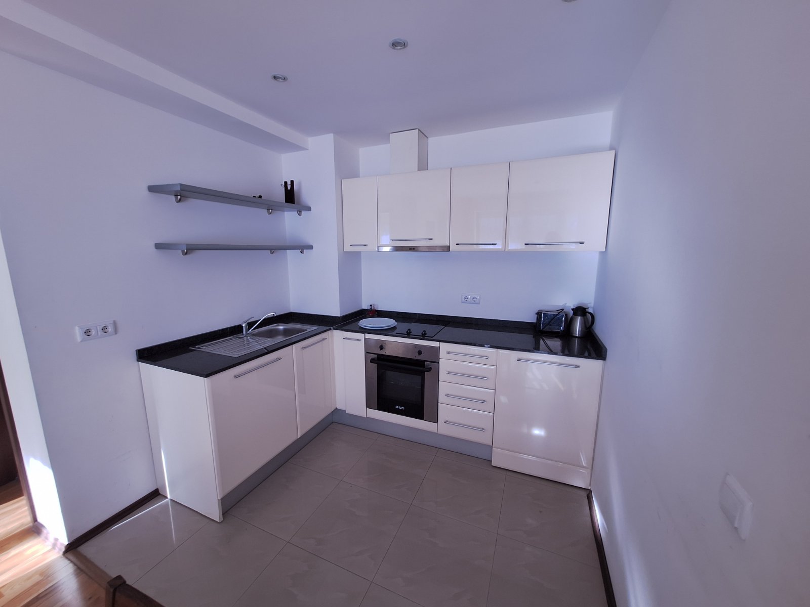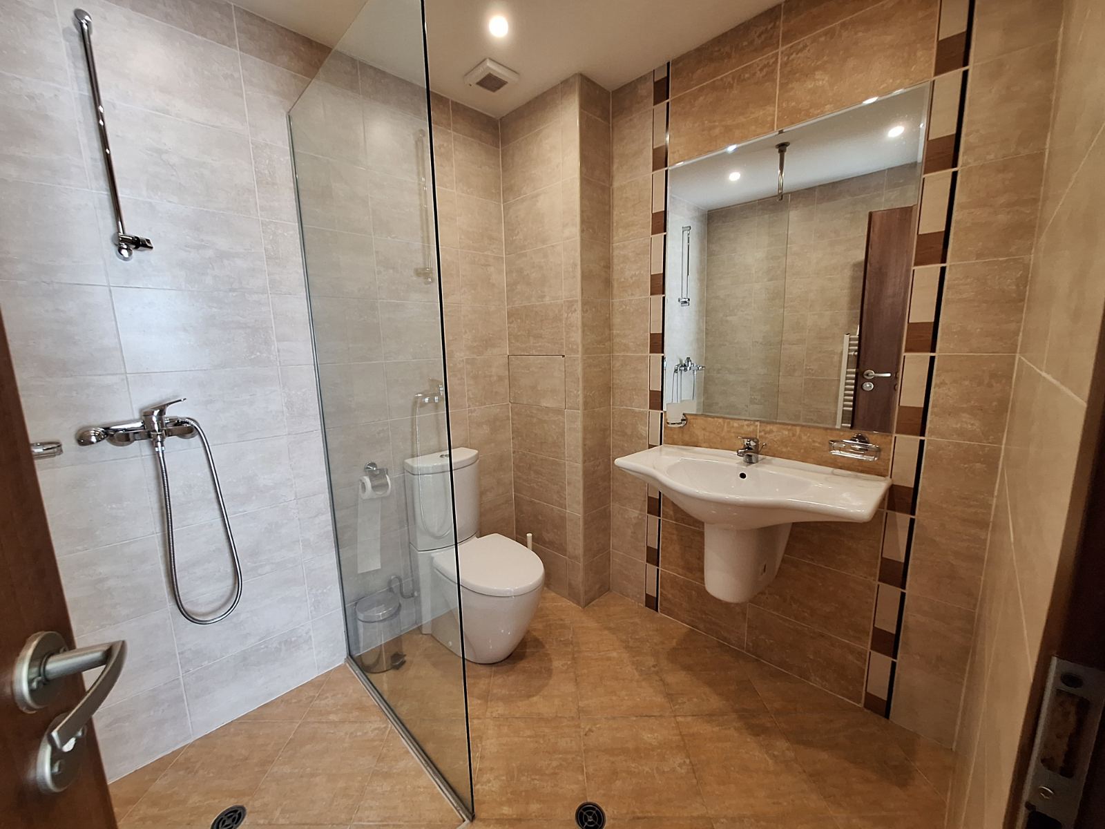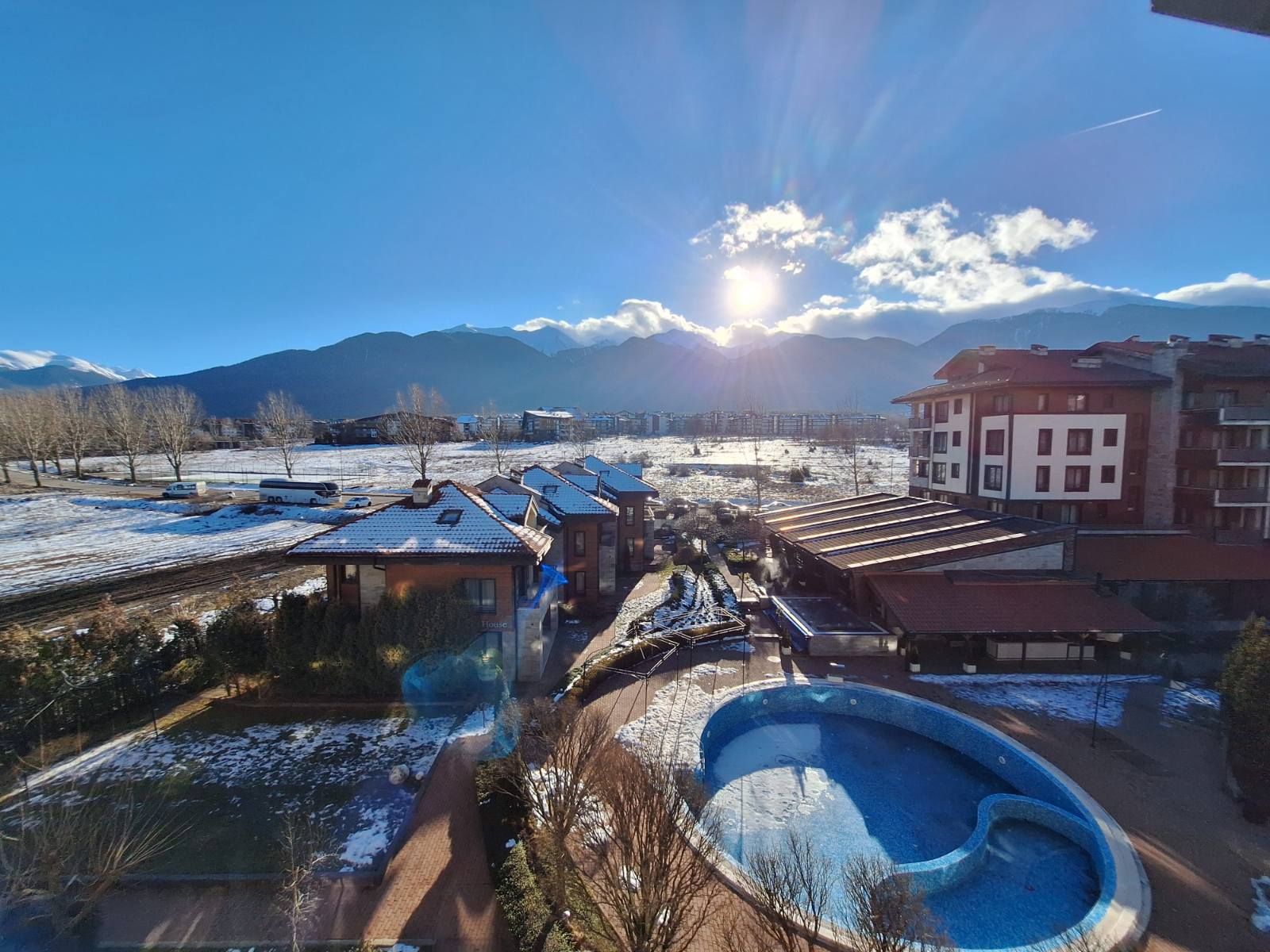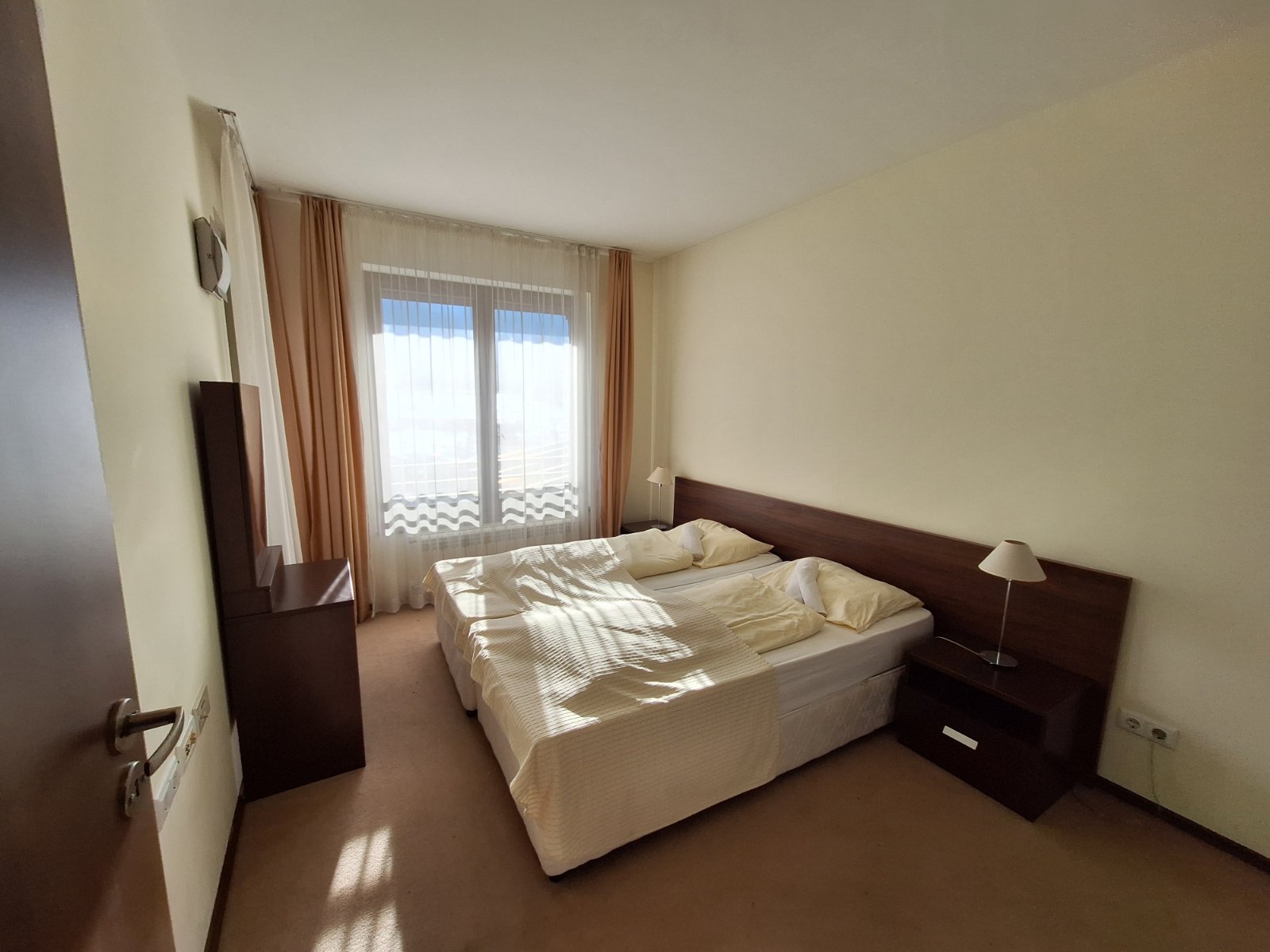 The interior layout is functional and designed for maximum comfort. It comprises an entrance hall leading to a spacious living room with a modern kitchenette, fully equipped with a washing machine, refrigerator, and stove. The master bedroom features its own private en-suite bathroom, providing privacy and convenience. A second bedroom is served by a second bathroom equipped with a bathtub. One of the highlights of this property is the expansive, sun-drenched balcony offering panoramic views of the Pirin Mountains. This property is an excellent choice for both a personal holiday retreat and a high-potential rental investment.